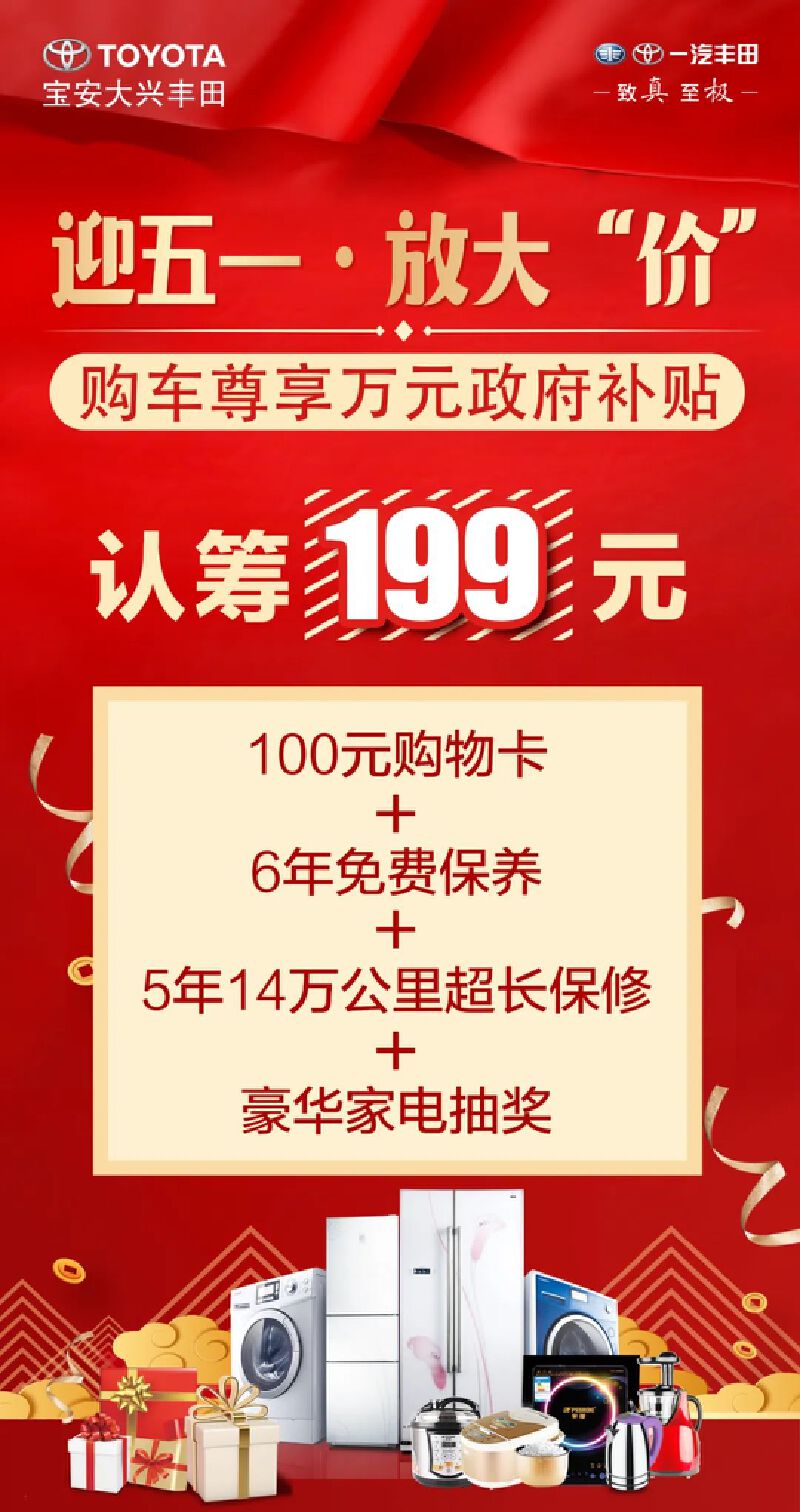 认筹199元=100元购物卡+6年免费保养+5年14万公里超长保修+豪华家电抽奖