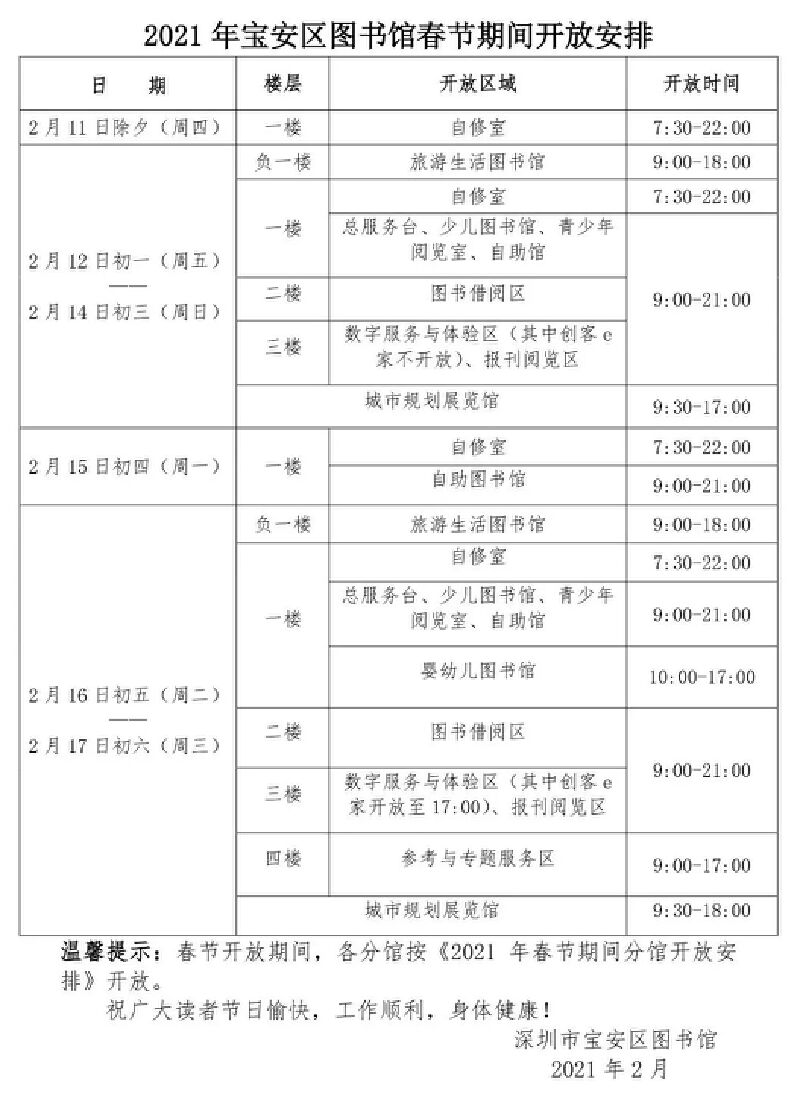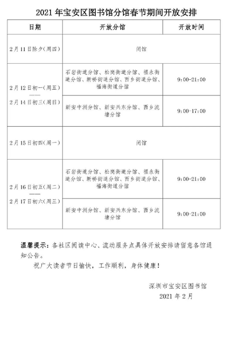 2021年宝安区图书馆春节期间开放安排(总分馆)
