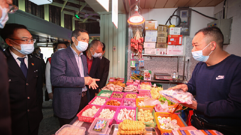 福中福市场是广受宝安群众喜爱的肉菜市场之一,平时客流量达3万人次左右。上午9时许,姚任来到该市场开展检查,现场可见市场各入口均已安装红外自动测温仪器,市场经营井然有序,市民们或流连各个档口挑拣菜品,或手中拎着大包小包,喜悦在脸上洋溢着。“最近生意怎样?春节假期休市吗?”“冻品都是从哪里进货的?有没有检测报告?”姚任随机抽检了主营冻品、水产、猪肉、牛肉、面食的多个档口,向档主了解货源安全、假期休市安排等信息,向市场监管部门了解春节假期全区肉菜保障情况,并检查了市场保洁、垃圾分类等工作。