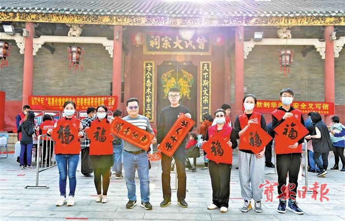 近日,由新桥社区党委、新桥社区党群服务中心开展的“笔墨传情党群连心 迎春纳福喜送春联”活动,为社区居民和留深人员送上新春祝福。古色古香的曾氏大祠堂,再现昔日大学堂的书香气。一副副大红的春联,给新桥社区增添了丝丝暖意。图为社区居民用写在春联纸上的吉祥话语,表达对新年的美好期盼。