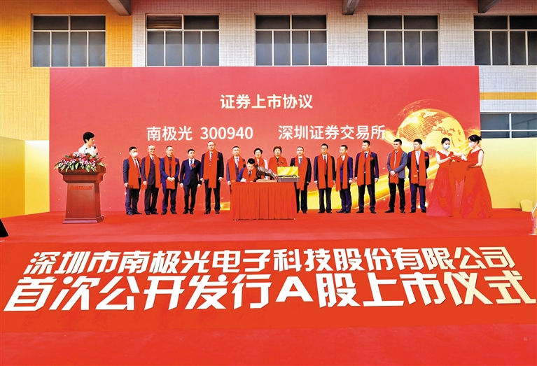 春,意味着风和日暖,也意味着耕耘播种。2月3日,正值二十四节气之首的立春,宝安区上市“军团”又新增一员“大将”——深圳市南极光电子科技股份有限公司(以下简称“南极光”)。伴随着南极光上市宝钟在深圳证券交易所云上市直播厅敲响,宝安区打响了2021年企业上市的第一“炮”。截至目前,宝安辖区境内外上市企业累计达53家,在资本市场打造了具有影响力的“宝安板块”。区人大常委会副主任刘红瑛、副区长梁敏华出席上市敲钟仪式。