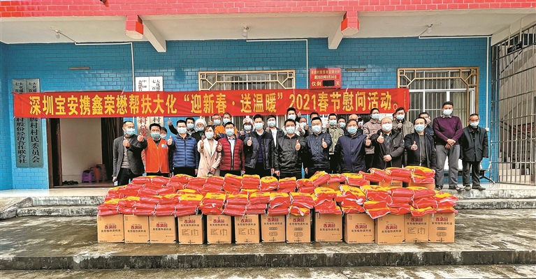 2月1日,正值春寒料峭时,鑫荣懋集团在宝安区对口扶贫办的带领下,开展春节慰问广西大化县七百弄乡弄腾村活动,为120户已脱贫家庭送上新年慰问物资,发放慰问金3.3万元。