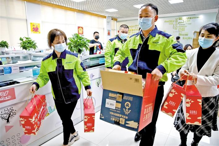 新世纪标志(深圳)有限公司,员工领取留深慰问品。