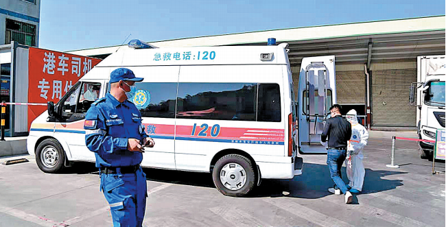 演练活动模拟一名跨境货车司机在专用休息区休息期间出现发热症状后,企业立即启动防控应急预案,并及时进行上报、隔离、转运、消毒等应急处置工作的全过程演练。