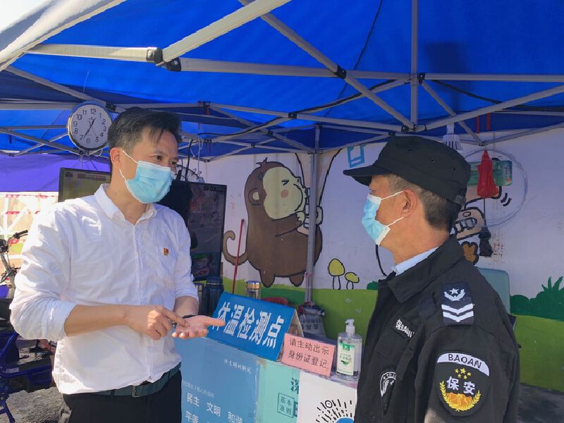 草埔西社区党委书记、工作站站长邓新锋在卡口与值班人员交流。