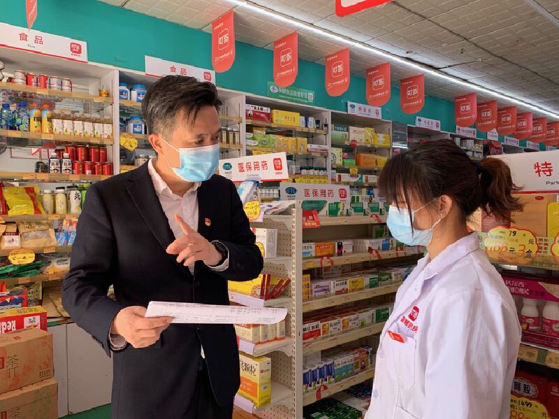 邓新锋了解药店的疫情防控情况。