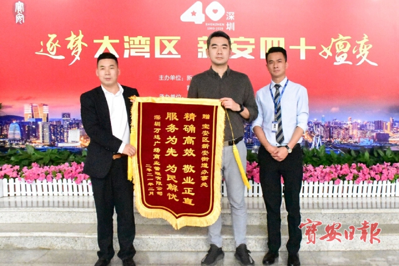 2月8日,深圳万达广场商业管理有限公司为新安街道办事处送上了“精确高效 敬业正直 服务为先 为民解忧”的锦旗,感谢新安街道办为企业高效解决了开业期间的各项诉求。