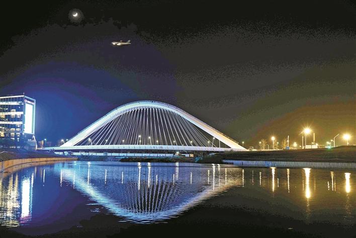 ▲空港新城截流河3#景观桥夜晚璀璨夺目。