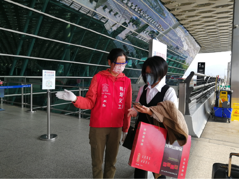 为旅客提供问询服务和交通指引,提醒旅客及时出示健康码,帮助行动不便及年长的旅客到指定窗口扫描身份证查验健康状况……从中午12点30到晚上8点30,江双红和女儿刘洁这对“母女档”以特别的默契,为来往的旅客提供各类细心、温馨的志愿服务,成为这个春节期间机场U站里一道靓丽的风景线。