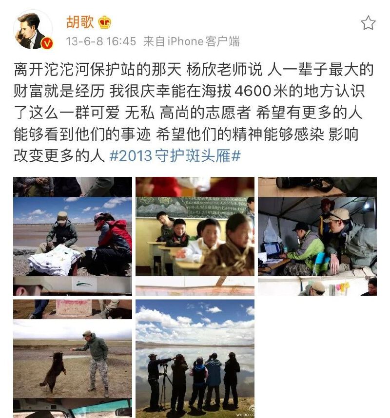 2013年,胡歌受邀成为斑头雁守护与调查项目的形象代言人。此后几乎每一年,胡歌都会去三江源进行公益活动,挑水、植树、捡垃圾……