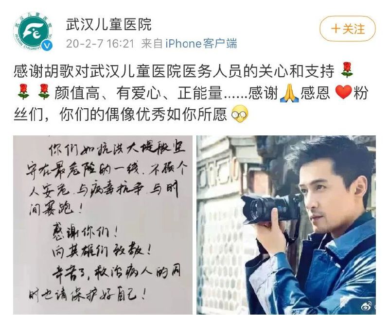 此外,去年疫情期间,胡歌还向武汉儿童医院捐赠了100台空气消毒机等近百万的医疗用品。