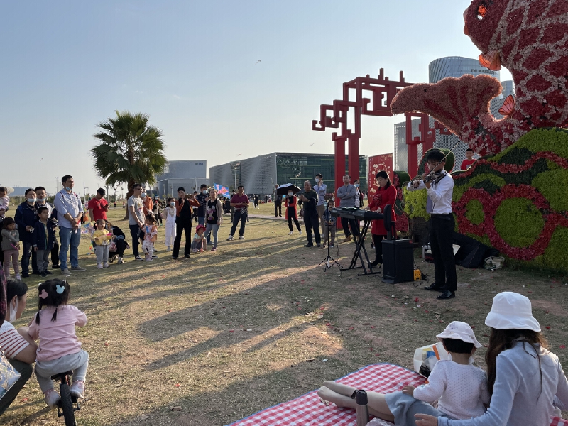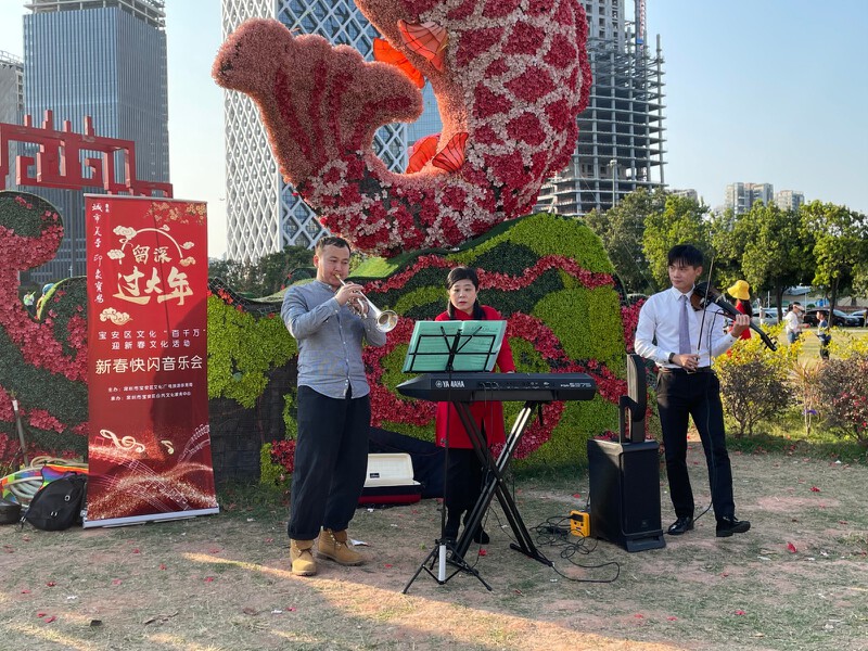 阳光烂漫的午后,宝图外熙熙攘攘的四季花田响起了悠扬的旋律。今天下午,以马内利组合在这里为留深市民带来了一场温暖的视听盛宴,小提琴、小号与键盘的奇妙碰撞,点燃了新春欢乐的气氛,也送上了新年美好的祝福。这也是宝安区文化“百千万”迎新春文化活动之一。