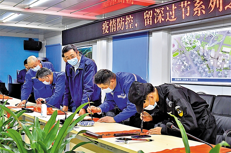 大年三十,中建科工滨海廊桥项目部一片热火朝天的景象,今年这里有近百名工友响应“就地过年”的号召留深过年,大家把春联贴起来、灯笼挂起来,还有包饺子、书法比赛等丰富多彩的活动,让宝安的工地“年味”十足。