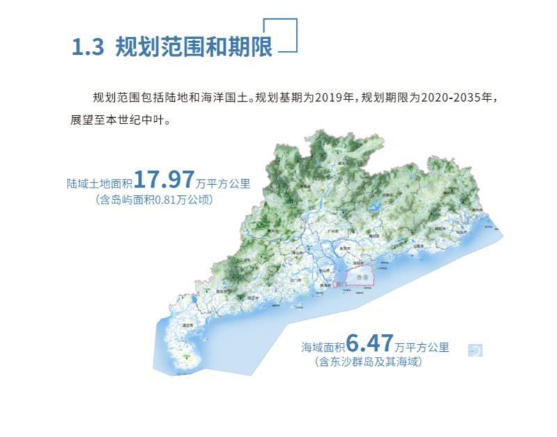 规划范围包括全省陆域面积17.97万平方公里(含岛屿面积0.81万公顷),以及海域面积6.47万平方公里(含东沙群岛及其海域)。规划期限为2020~2035年,展望至本世纪中叶。