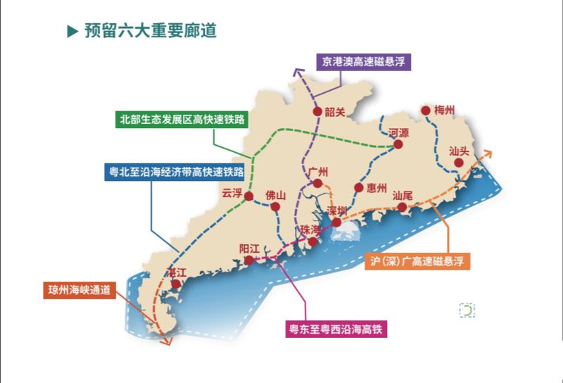围绕构建“一核一带一区”(一核一带一区分别为:珠三角核心区、沿海经济带、北部生态发展区)区域发展格局,规划提出,上海-汕头-汕尾-深圳-广州、北京-韶关-广州-佛山-珠海-澳门的磁悬浮线路,还有阳江-珠海-深圳高铁(赣深客专西延线)、琼州海峡通道。