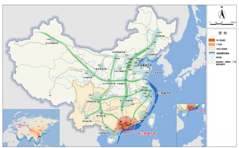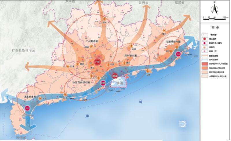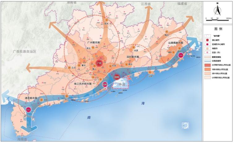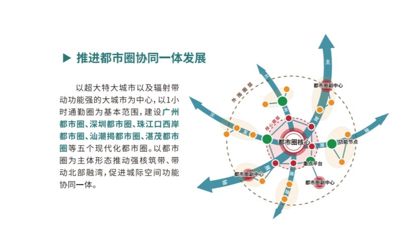 以超大特大城市以及辐射带动功能强的大城市为中心,以1小时通勤圈为基本范围,建设广州都市圈、深圳都市圈、珠江口西岸都市圈、汕潮揭都市圈、湛茂都市圈等5个现代化都市圈。