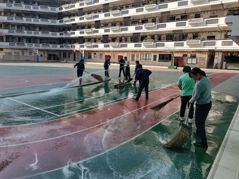 后勤工作人员对学校进行全方位的打扫,对办公室、教室、功能室、图书馆、篮球场、架空层等的每个角落进行清洗和消毒,为教师、学生返校提供全方位的安全保障。
