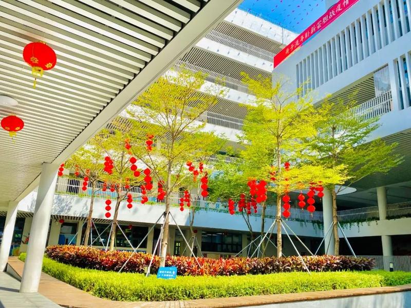 光明区高级中学校园里张灯结彩,洋溢着浓浓的年味。教职工们井然有序地为新学期开学做足各项准备工作,迎接师生返校。