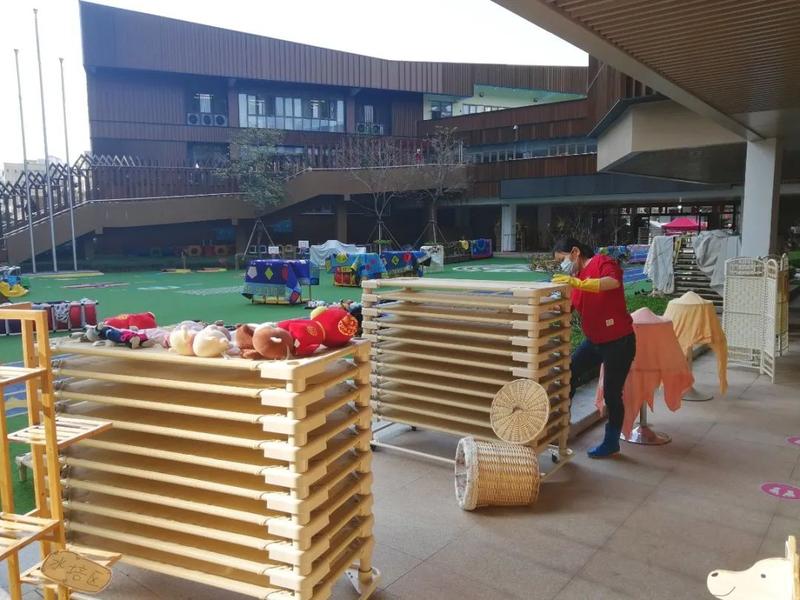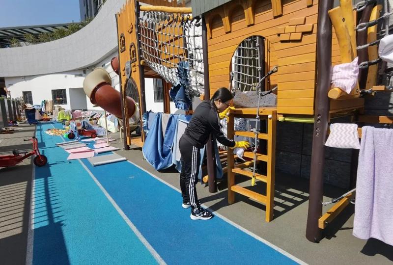 由安全干事组织全园严格按照要求进行开学前的安全工作排查;保健室医生及防疫物资管理员对园内新冠疫情防疫储备物资进行核对,并及时补充相关物资;聘请专业消杀公司对全园进行户外消杀;饮用水供货商对全园饮水机进行清洁消毒,聘请专业公司对全园水池进行清洁消毒;专业保洁机构对园内大型户外玩具和班级床铺进行了清洗消毒。班级老师做好本班的卫生消毒工作,厨房也进行全面清洁消毒,油烟净化系统清洗,确保安全顺利开学。