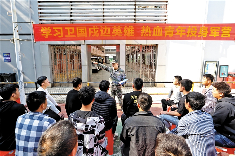 区征兵领导小组副组长、区人武部政委王危正在给应征青年讲述新时代卫国戍边英雄官兵事迹。