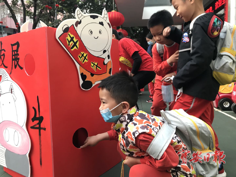 带福袋入园有何用意?原来,是用来装新年礼物的!什么新年礼物?园方为每个小朋友都精心准备了一个平安果(苹果)!不过,派发平安果的方式各不相同。记者了解到,有的分园在校门口放置了一个装有平安果的“牛牛箱”,供幼儿摸取;有的分园则让老师扮成“米奇”“米妮”,负责派发平安果;有的分园则将平安果藏在教室的个个角落,然后组织幼儿进行寻宝;有的还将平安果摆成特别的造型,然后老师将各班小朋友的名字牌放入箱子,由小朋友来抽签念名字,互送苹果互送祝福……放学时,小朋友们再将平安果用福袋带回,与家人分享。