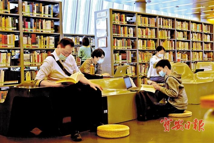 宝安图书馆内,春节的节日气氛犹在,市民全神贯注地沉浸书海中。