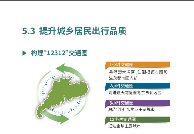 在此基础上,广东将最终打造成“12312”交通圈,即1小时直达粤港澳大湾区、汕潮揭都市圈和湛茂都市圈内部;2小时直达粤港澳大湾区和粤东西北地区;3小时通达全国乃至东南亚的主要城市;12小时通达全球主要城市。