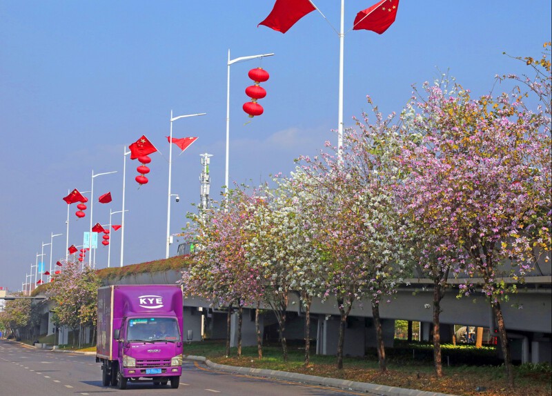 两旁盛开的白花羊蹄甲扮靓机场南路