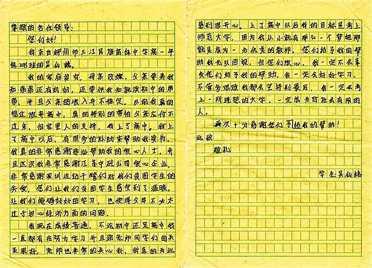广西柳州三江民族高级中学高一2013班吴仙桃同学亲手写的感谢信