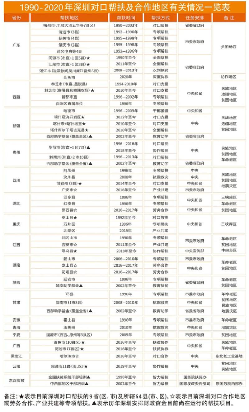 30年来,深圳先后与广东省内、西藏、新疆、贵州、广西等17个省区(直辖市)及所辖109个县(区)建立结对帮扶关系。