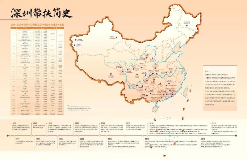 1990年,广东省委省政府《关于进一步支持山区市和新建市发展经济的决定》,安排深圳对口帮扶梅州市。 1991 1991年,深圳成立对口扶持工作领导小组及办公室。 1992 1992年,深圳开始对口支援三峡库区巫山县。 1994 1994年,中央第三次西藏工作会议确定广东省及深圳对口支持西藏林芝地区,先后帮扶林芝地区和墨脱县。 深圳对口支援西藏林芝地区援建深圳大道、鹏城广场等一批市政重点项目。 1995 1995年,深圳对口帮扶贵州省黔南布依族苗族自治州三都水族自治县。 1996 1996年,中央实施东西部扶贫协作战略,确定深圳对口帮扶贵州省毕节市和黔南州。 1998 1998年8月,深圳援建州省三都县深圳路建成通车。 1998年9月,深圳市建设投资控股公司援建的大塘天健小学启用。 2002 2002年,广东省委省政府印发《关于加快山区发展的决定》,调整深圳市对口帮扶河源市及其五县一区(东源县、紫金县、龙川县、和平县、连平县和源城区)。 2002年1月,深梅对口帮扶工作座谈会召开。 2005 2005年11月,深圳向贵州省毕节地区和黔南自治州捐赠物资。 2006 2006年,深圳市关爱办和深圳商报社发起“募师支教”项目,全国首创民间出资招募志愿者赴山区扶贫支教模式。 2008 2008年,按照中央和广东省的抗震救灾部署,深圳除支援四川汶川抗震救灾外,对口支援甘肃省受灾最严重的陇南市武都区、文县、康县,并在陇南设立前方指挥部。 2008年5月16日,四川省汶川县映秀镇漩口中学的一名教师从废墟中被救出,深圳医疗队队员对其进行救治。 2008年7月,深圳陇南抗震救灾对口支援农产品购销合同签约。 2008年12月,罗湖区人民政府获“全国东西扶贫协作先进单位”。 2009 2009年,广东省印发《关于我省扶贫开发“规划到户、责任到人”工作的实施意见》,深圳定点帮扶湛江、河源290个贫困村,开展第一轮扶贫开发“双到”工作。 2009年,深圳援建甘肃省甘南、陇南的灾后重建工程项目竣工。 2009年12月,深圳与汕尾共建的产业转移工业园签约40个产业转移项目,投资总额476亿元,创历史新高。 2010 2010年,根据中央安排,深圳市制定实施对口支援新疆工作方案,成立深圳对口支援新疆工作前方指挥部。 2010年,深圳开始对口支援西藏林芝市察隅县和察隅农场。 2010年,深圳投入3410万元建设援疆民生重点工程塔县人民医院,安排2500万元资金提升硬件设备。 2011年 2011年3月,深喀社工站成立,开启“小母羊”扶贫等项目。深喀社工站被民政部评为首批全国社会工作服务标准化建设示范单位。 2011年5月,深圳医疗队员重返震后映秀,为群众义诊。 2011年6月,深圳市年度援疆十大重点项目开工奠基。 2011年10月,喀什深圳产业园揭牌,首批西进的深港企业与喀什签下总投资37亿元开发建设项目。 2011年,南山区经济促进局(对口扶持办公室)、深圳市投资控股有限公司获全国扶贫开发先进集体。 2013 2013年11月,根据广东省委省政府新一轮扶贫“双到”工作部署,深圳市对口帮扶河源、汕尾两市190个省定贫困村。 深圳中环油集团启动塔克拉玛干沙漠造林工程,6年成功造林33万亩,缔造科学治沙、生态扶贫的绿色奇迹。 2014 2014年,按照中央和广东省安排,深圳对口支援甘孜州石渠县、德格县和甘孜县。 2014年1月,深圳印发《进一步深化对口帮扶工作方案》,深圳对口帮扶汕尾指挥部、深圳对口帮扶河源指挥部揭牌。 2014年8月,四川广安(深圳)共建产业园区正式授牌。 2014年12月,光明区工业和信息化局获“全国社会扶贫先进集体”。 2015年 2015年起,深圳安排2亿元民生帮扶资金,支持深河中学等河源市十大民生项目建设。 2015年8月,腾讯基金会正式向全国发布“腾讯为村”, 以网络扶智促乡村脱贫攻坚。 2015年11月,深圳援建比亚迪陆河工厂在新河工业园区第一家投产,成为拉动县域经济发展强劲引擎。 2015年12月,恒大集团启动贵州省毕节市整体脱贫帮扶工作,累计投入110亿元、派驻2108名扶贫人员,开创政企协作新高度。 2016 2016年1月,深圳印发《深圳市联系四川省甘孜藏族自治州石渠县、德格县、甘孜县工作实施方案》,对甘孜州石渠县、德格县和甘孜县实施帮扶。 2016年6月,根据省委省政府印发《关于新时期精准扶贫精准脱贫三年攻坚的实施意见》,深圳市定点帮扶河源市、汕尾市324个贫困村。 2016年9月,根据中央和省的统一部署,广东省帮扶广西壮族自治区,由深圳市牵头负责,深圳市重点帮扶广西百色、河池市及所辖17个贫困县(市)。 2016年10月,《深圳对口广西百色、河池扶贫协作工作方案》印发,广东省第二扶贫协作工作组成立。 2016年11月,根据中央部署,哈尔滨市与深圳市开展对口合作。 2016年12月,深圳市对口支援办公室荣获 “全国扶贫系统先进集体”。恒大集团董事局主席许家印获2016年全国脱贫攻坚奉献奖。 2017 2017年3月,中兴通讯(河源)基地一期项目建成,全部建成后预计可实现年工业总产值超1000亿元、税收超10亿元、提供4万个就业岗位。 2017年5月,深圳援建的广西都安扶贫产业“贷牛还牛”项目暨牛犊首发仪式举行,分期投入1080万元,惠及2000户建档立卡贫困户。 2017年6月,广东省党政代表团赴新疆喀什学习考察。广东省委副书记、省长马兴瑞在深圳援疆企业美丽奥服装公司调研。王伟中同志在新疆塔县“5·11”地震临时安置点看望受灾群众。 2017年,深圳投入专项帮扶资金32亿元,帮助河源、汕尾各建一所现代化三甲
