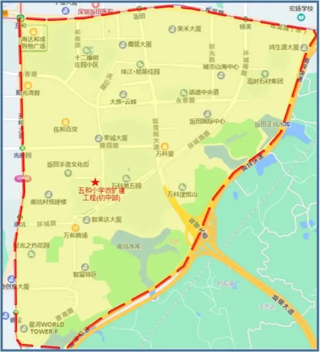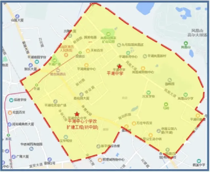 招生范围:坪西社区,包含君胜熙珑山、今日香沙御景园、吉祥悦府、嘉豪盛世、利得悦府、香林世纪华府等住宅区域。招生范围:学校由纯小学升格为九年一贯制学校。升格后,其小学招生范围保持不变;初中招生范围与坂田实验学校初中部共享:五和社区(不含五和大道以西区域)、五园社区、南坑社区、马安堂社区。招生范围:学校由纯小学升格为九年一贯制学校。升格后,其小学招生范围保持不变。初中招生范围与平湖中学共享:新南社区、凤凰社区、平湖社区(由铁路、富安大道、平湖大街、良白路所围成的熙璟城及富民工业区等片区除外)、坤宜福苑。