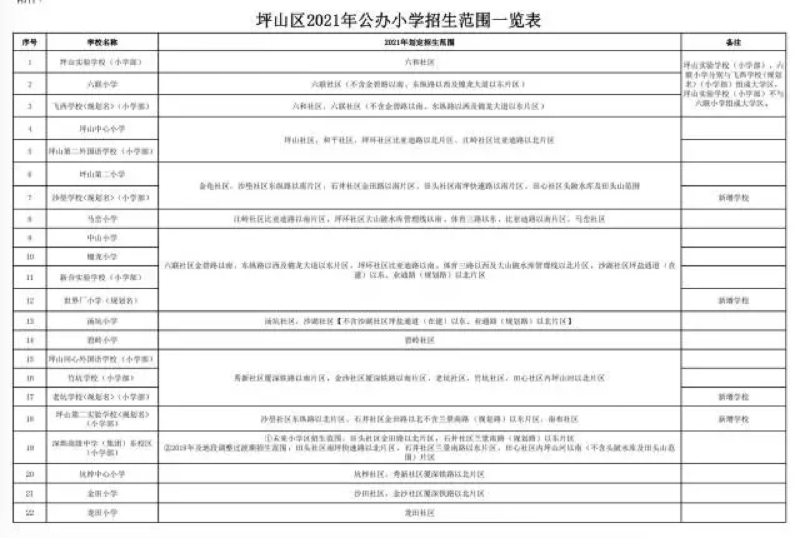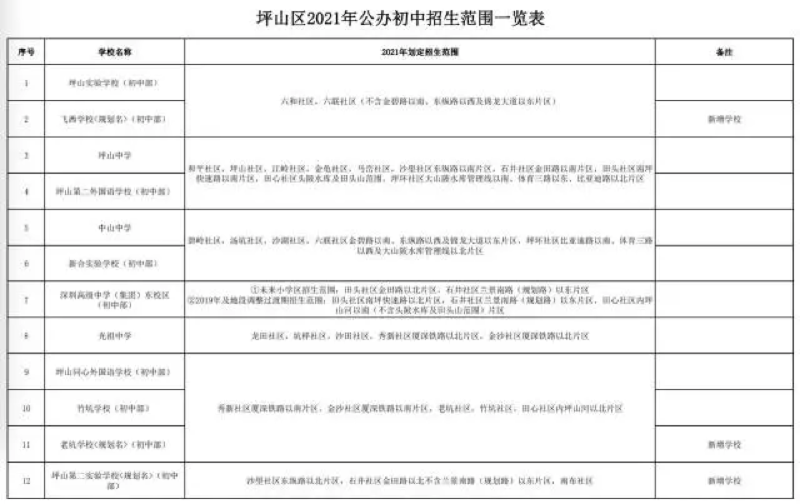 备注:公示所用学校名为项目建设名称,非正式校名;2021年新建、改扩建学校招生及开办具体时间以学校实际建设情况为准。去年,坪山区就发布2021年秋季义务教育阶段新增及部分现有公办学校招生范围公示征求意见稿。