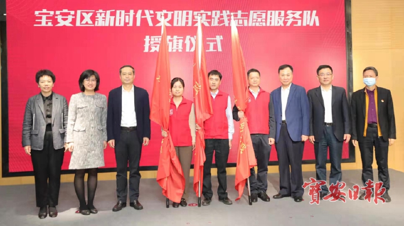 区委书记姚任、团市委书记方琳和市委宣传部副部长、市文明办主任陈庆澜一同为服务队代表授旗。区委常委、区委区府办主任孟锦锦,区委常委、宣传部部长周学良,中央中长期青年发展规划专家委员会委员、广东省社工与志愿者合作促进会会长、宝安志愿者学院名誉院长谭建光教授出席活动。