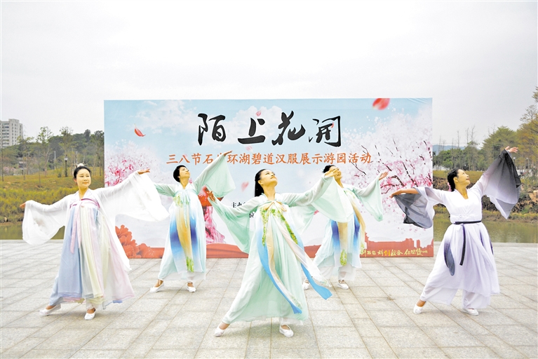 石岩妇联举办三八节石岩环湖碧道汉服展示游园活动。