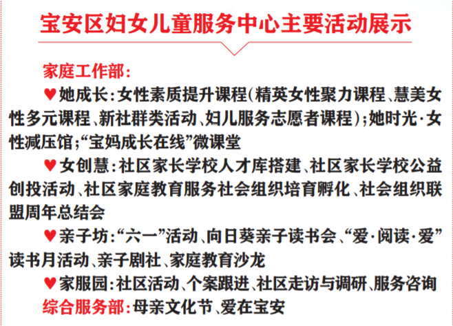 三级妇儿服务清单中,区妇女儿童服务中心的“她成长”“女创慧”“家服园”和“亲子坊”四大公益服务平台活动更是精彩纷呈。“她成长”为现代女性提供学习成长的课程,仅仅“宝妈成长在线”微课堂这个项目便计划辐射21万人次;“女创慧”培育孵化社区家庭教育服务社会组织,打造女性社会组织创新聚慧空间;“家服园”开展社区调研与走访,以专业的社工服务手法与社区社工业务交流对接;“亲子坊”开展“爱·阅读·爱”读书月活动,打造全国家庭教育学会示范基地。此外,教授分享类、交流互动类、实操体验类、社区家长学校、四点半课堂等提升妇儿综合素质的服务也是清单中极其重要的内容。这些活动很好地响应妇女儿童友好型城区创建工作,营造良好的干事创业氛围,号召全社会一起重视、关心和陪伴妇女儿童成长,号召宝安巾帼勇于提升自我,为湾区建设贡献她力量。