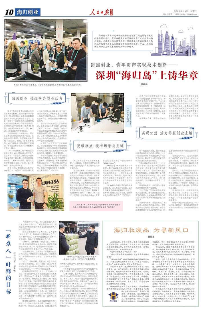 《人民日报海外版》大篇幅报道海归团队在宝安海归岛创业的故事。