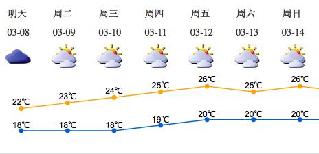 周一至周二(8-9日)多云间阴天,早晚有分散小雨和轻雾,周一气温18-22℃;周三(10日)阴天有分散小雨和轻雾,沿海、高地和海区偏东阵风7级左右;周四至周日(11-14日)多云可见阳光,天气温暖。春天多雨雾天气,能见度较低,需注意水陆交通安全管理;周三东风清劲,请注意防风。