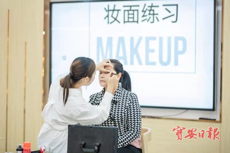 ▲商会女企业家们学习化妆知识。