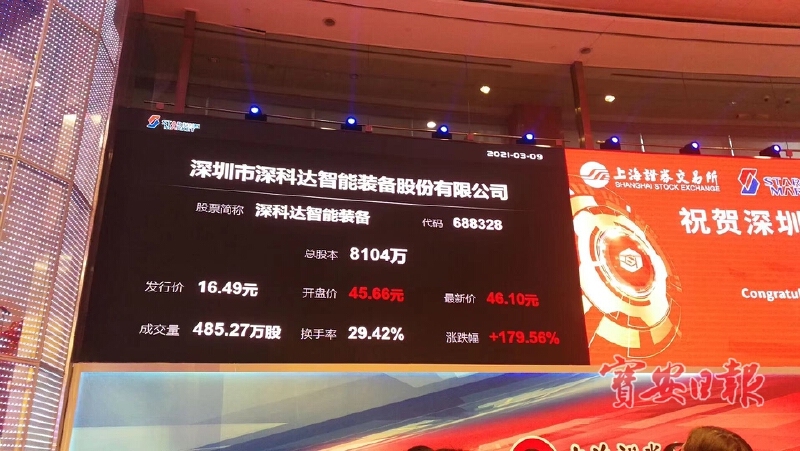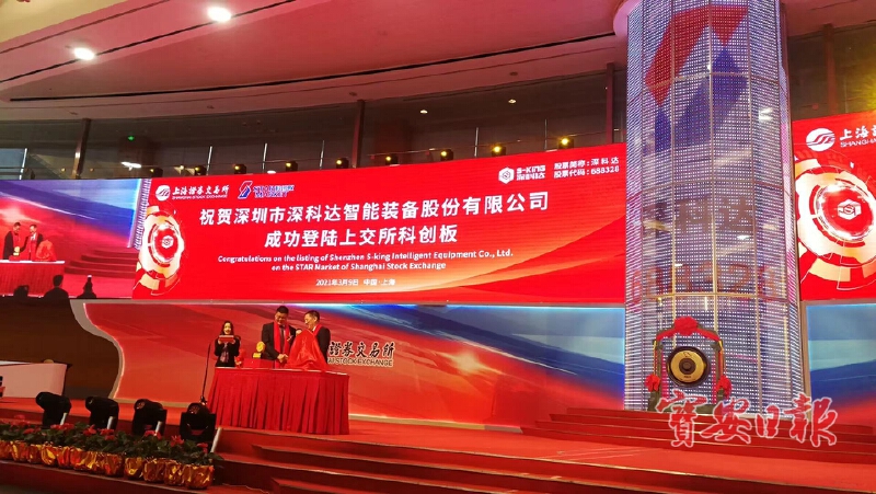 今天上午,宝企深圳市深科达智能装备股份有限公司在上交所敲响科创板宝钟(简称“深科达”,股票代码:688328),成为宝安区首家在科创板上市的企业。宝安区工业和信息化局副局长姜建响等赴上海上交所参加企业上市敲钟仪式。