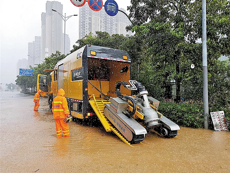 遇大雨路面积水,排水公司用“龙吸水”大型抽水设备应急抽排。