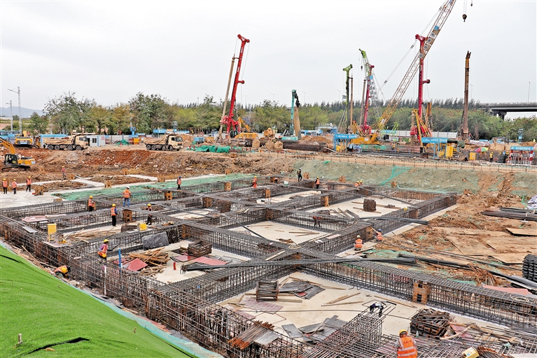 湾区产业投资大厦正开展支撑梁钢筋绑扎施工及土方开挖外运
