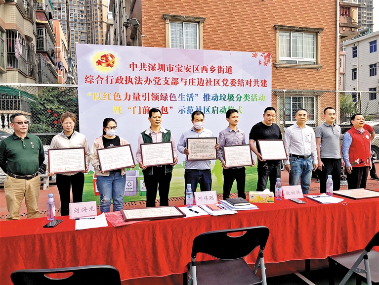 3月10日下午,西乡街道综合行政执法办党支部联合庄边社区党委开展结对共建“以红色力量引领绿色生活”推动垃圾分类活动暨“门前三包”示范社区启动仪式。30名党员及100余家商户负责人参加了启动仪式。