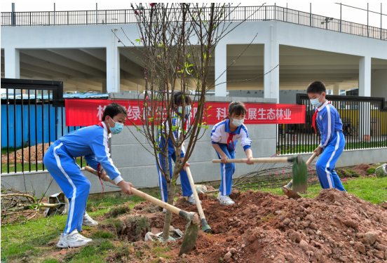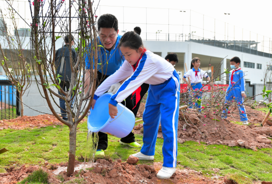 植树现场,热闹非凡。广大干部群众分工协作,精心对待扛苗散苗、挥锹铲土、扶苗踏实、栽树浇水等各环节,栽得认真,干得卖力,整个植树活动现场一片热火朝天的劳动景象。一阵忙碌之后,300余株新栽的红桃花苗木挺立在三月的和煦春风里,与清平实验学校交相辉映,勾勒出一幅“桃李满天下”的美好画卷。