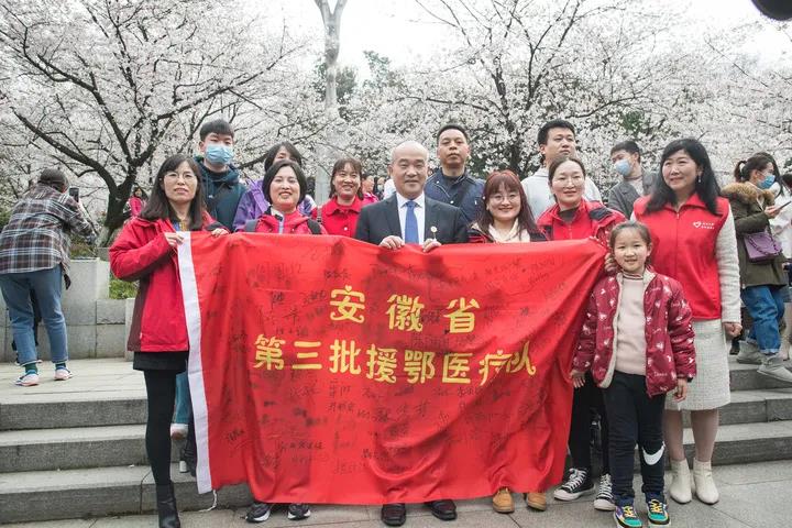 援鄂医疗队队员们在樱花树下