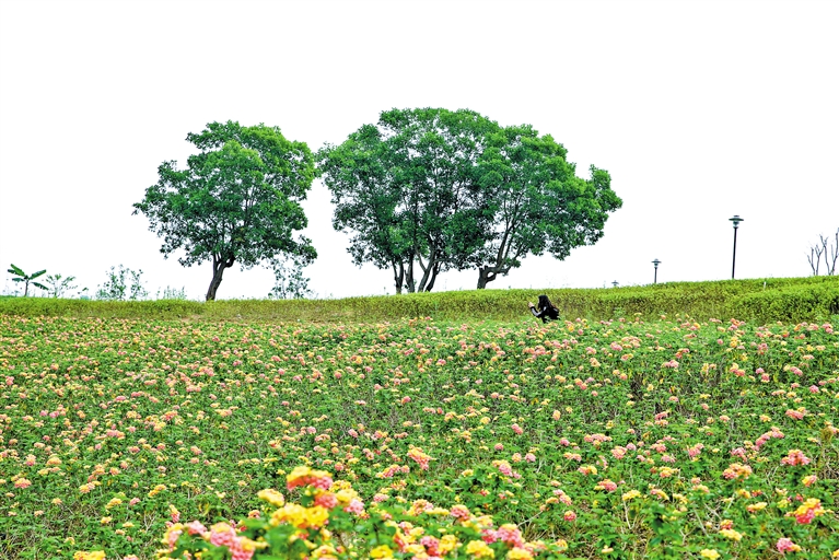 若想看到连绵起伏的花海,那就要来到陌上花。五亩园里,马缨丹、蓝雪花、大红花相继绽放,蝴蝶和雀鸟在其间嬉戏。如果运气好,抬头望向碧道上方的蓝天,还能见到结队的大雁、盘桓的雄鹰、优雅的白鹭,眼前的画卷愈加饱满丰富。