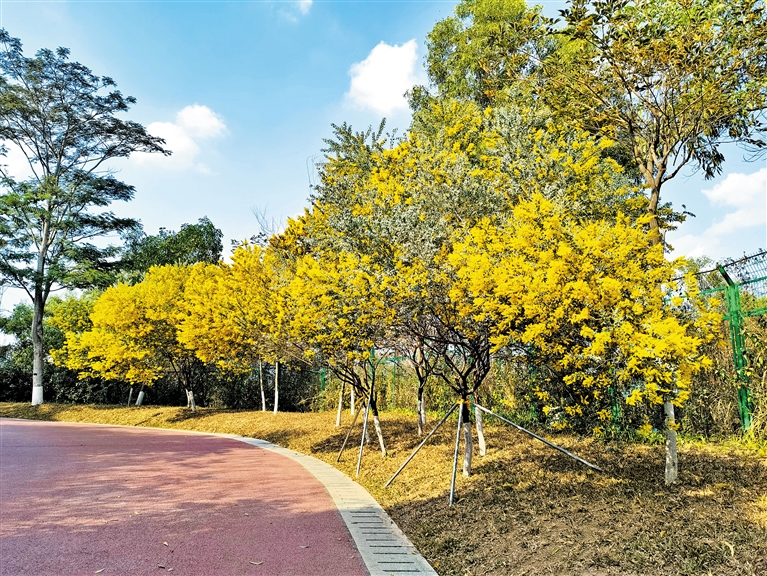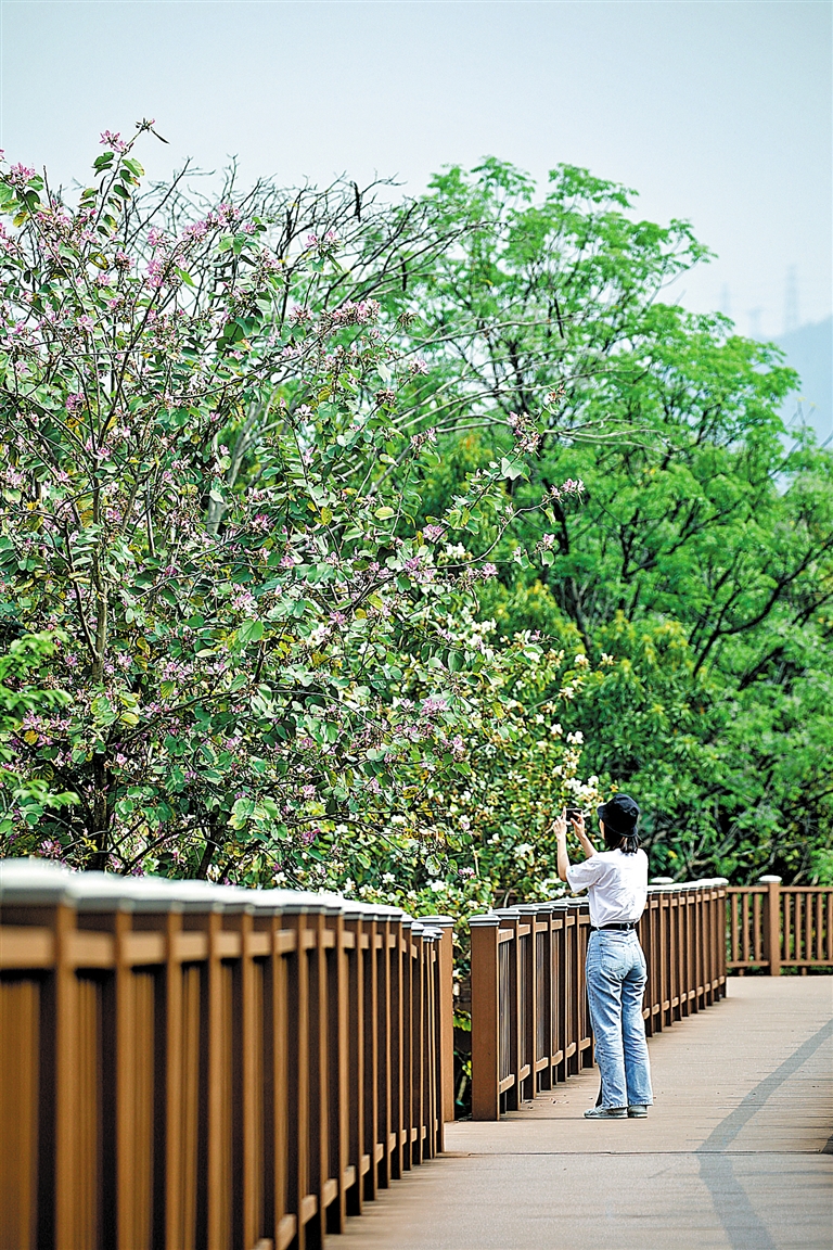 环湖碧道美景无处不在,随时准备为游客奉上惊喜。例如俯仰之间一抹不期而遇的明黄——临近“一层楼”凉亭的碧道两侧栽种着银叶金合欢,花期时整个树冠是壮丽的金黄灿烂,花谢后露出银白色的叶片,如同轻盈柔软、镶着白边的蓝绿色羽毛;又如木栈道旁长得高大的羊蹄甲和木棉花,整树的嫩粉、洁白、艳红,是木栈道上最亮眼的风景。