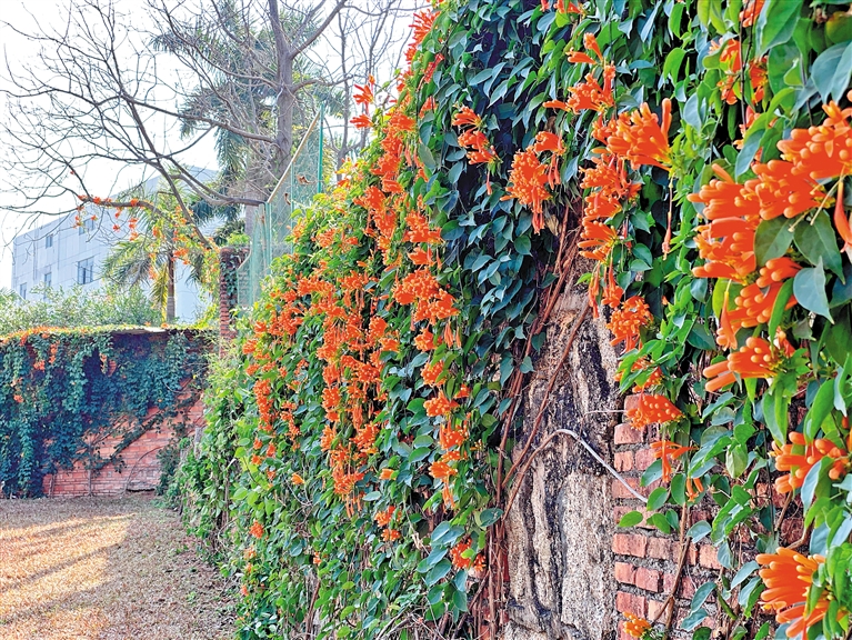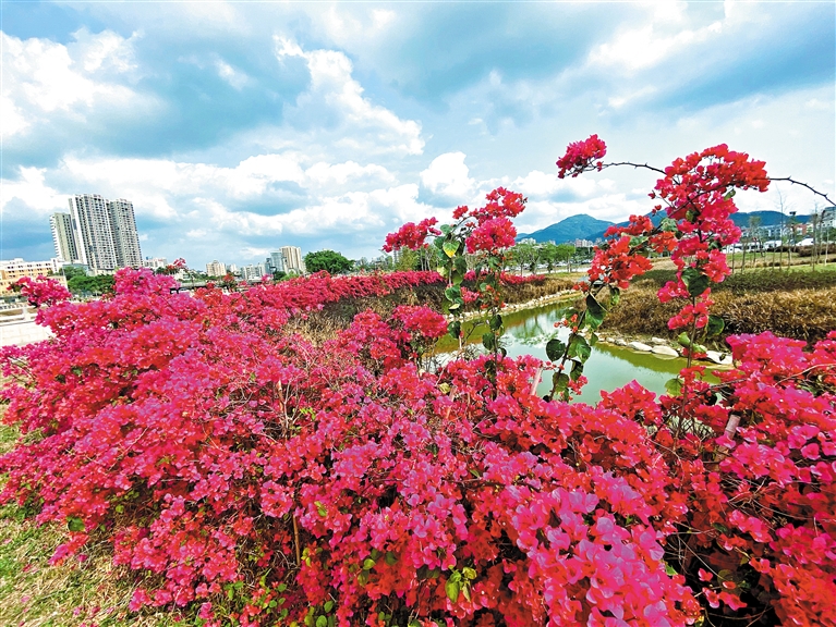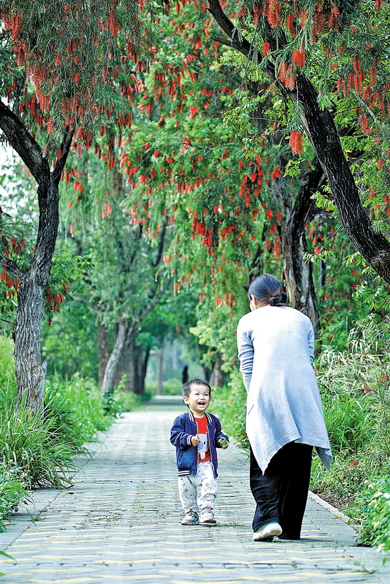 湿地公园里,24座水系桥串联起人工湿地,水系两岸的簕杜鹃浓烈似火,莺啼燕舞穿梭其间,正是诗句“小桥流水飞红”所描写的惬意春景。往公园深处走,红千层茂密的树荫遮盖了一条小径,形成一条红色的“连廊”,串串红色花朵压弯了树枝,远看像是深圳街边挂满红色小灯笼的树木,走近后便能听到成群蜜蜂煽动翅膀的嗡嗡声,还能闻到淡淡的桉叶香气。