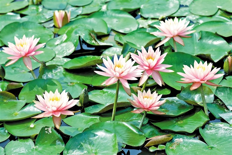 三月份的青草排也有花景。沿着被琴叶珊瑚和蓝花草簇拥的环湖碧道一直向北走,来到映日池旁,能见到大片刚盛开的莲花。深圳温暖的气候,让莲花在三月就悄悄盛开,新长出的墨绿莲叶油光发亮,粉色的莲花娇艳欲滴,又是“粉腻黄丝蕊,心重碧玉钱”的诗意景观。