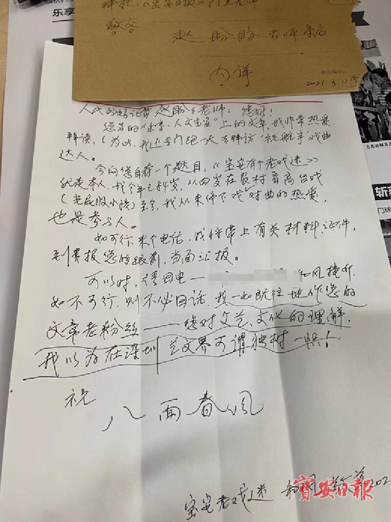 “向您自荐一个题目——《宝安有个老戏迷》,就是本人。我今年已84岁,从4岁在农村看高台戏至今,从未停下对戏曲的热爱……”近日,记者收到本报老读者和风(原名黄玉芳)的“自荐信”。随即,记者约访到这位84岁的“老戏迷”。“戏曲影响了我的一生,戏曲是中华传统文化的魂,是我们取之不尽用之不竭的精神食粮。”他说。